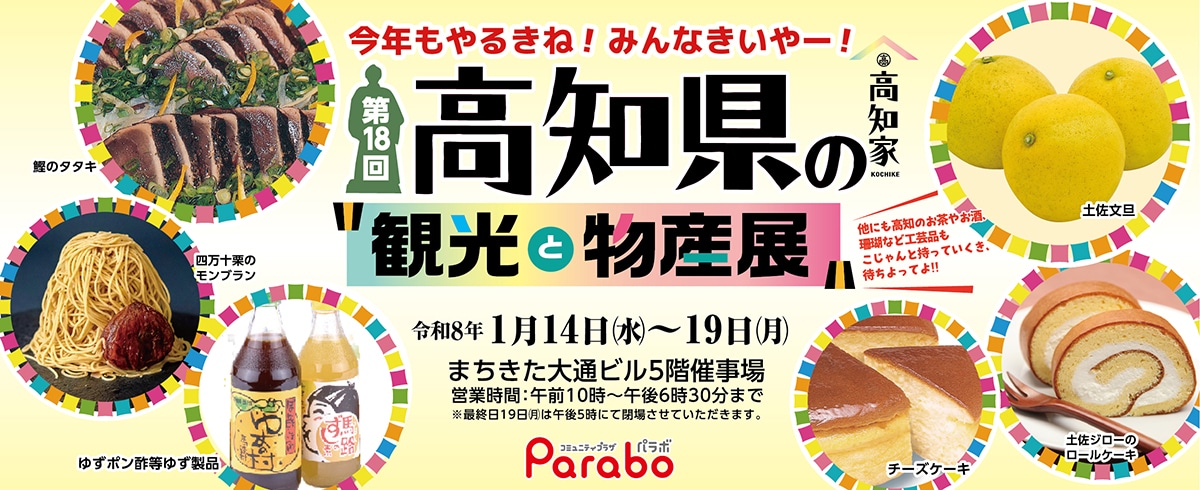 【HPトップバナーにてチラシ公開中(イベント終了まで)】 参加店舗や出店舗をご確認ください! 新春恒例!「高知県の観光と物産展」を、 令和8年1月14日(水)~19日(月)の6日間開催いたします! カツオや文旦、ゆず製品、スイーツ、土佐地酒、 土佐あかうしなどの魅力あふれる高知のご当地グルメの他、 端野町の姉妹都市「...